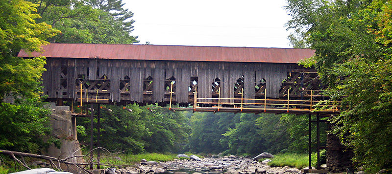 This project was substantially completed in six months. This bridge spans 121-feet across the Black River and is built in the Town Lattice Truss style. The work on the bridge structure involved substantial structural repairs to the each lattice truss, including complete replacement of the bottom chords, 30% replacement of lattice members, all new floor beams and lower lateral bracing, new laminated deck, partial rafter and knee brace replacement, and all new roof sheathing and siding. New standing seam metal roofing was also installed.